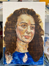 I haven't sanded this gesso ground, as much as I normally do. The intention is to create a textured effect on the surface. This can be seen in the indented pattern created within Dr Bushera's Hair and dress. I will layer more paint over her hair. However, I want the pattern created by the reduction in sanding to appear on her dress, so I won't add to many more layers to this so it remains.
